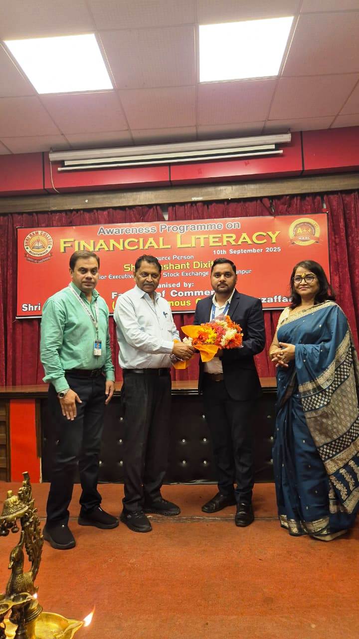 The keynote speaker, Prashant Dixit, briefed everyone on the program's objectives and explained that before investing in the stock market, we must have three types of accounts: savings, demat, and trading accounts. He also explained that six thousand companies are registered on the Bombay Stock Exchange. Before investing in any company, it's important to consider its price-earnings ratio, its debt, and its balance sheet status. He informed all the students about investment and cybersecurity. He explained how we can save a portion of our income and how and where to invest it. He also provided detailed information about the Bombay Stock Exchange and SEBI. He also informed the students about insurance, explaining how we can protect our families from financial difficulties by purchasing health and life insurance. He also provided detailed information about inflation and informed them about investment methods in the capital market. He explained in detail about mutual funds, demat accounts, SIP applications, and other applications. A question-and-answer session was held at the end of the program, in which all students participated enthusiastically. The keynote speaker also answered all the students' questions satisfactorily. Following this, Dr. Saurabh Mittal, Vice Principal of the Commerce Department, and Dr. Ashfaq Ali, Head of the Department, jointly presented the keynote speaker with a memento and expressed their gratitude for his valuable time. The Head of the Commerce Department formally concluded the program with a vote of thanks and emphasized the need to organize similar programs in the future.