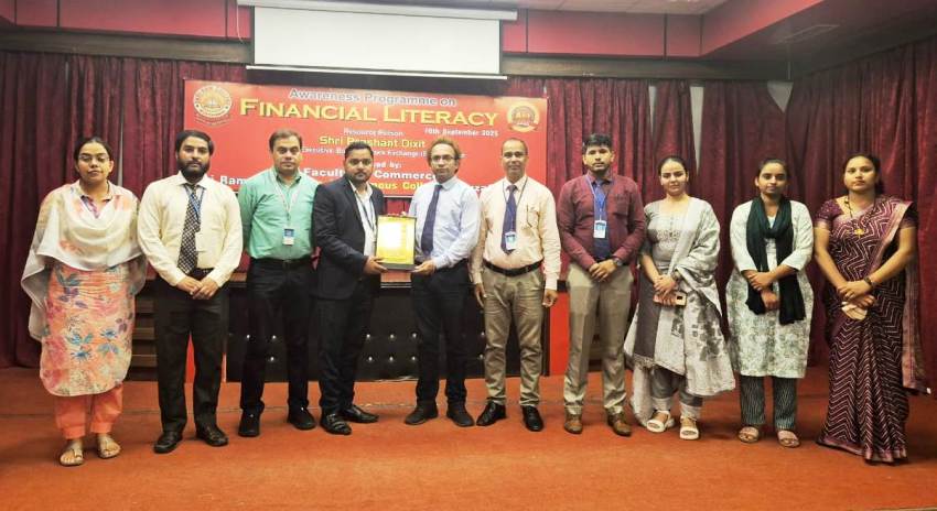 The Commerce Faculty of Shri Ram College organized a one-day "Financial Literacy Awareness Program" for students and faculty in the Management Block. The program began with the lighting of a lamp jointly by Shri Ram College Director Dr. Ashok Kumar, Principal Dr. Prerna Mittal, Vice Principal Saurabh Mittal, Commerce Department Head Dr. Ashfaq Ali, and the program's keynote speaker Prashant Dixit. First, Dr. Ashfaq Ali, Commerce Department Head, and Shri Ram College Director Dr. Ashok Kumar welcomed the keynote speaker by presenting him with a bouquet. Dr. Ashfaq Ali, Commerce Faculty Head, briefly explained the awareness program and invited the keynote speaker to the stage for his lecture.