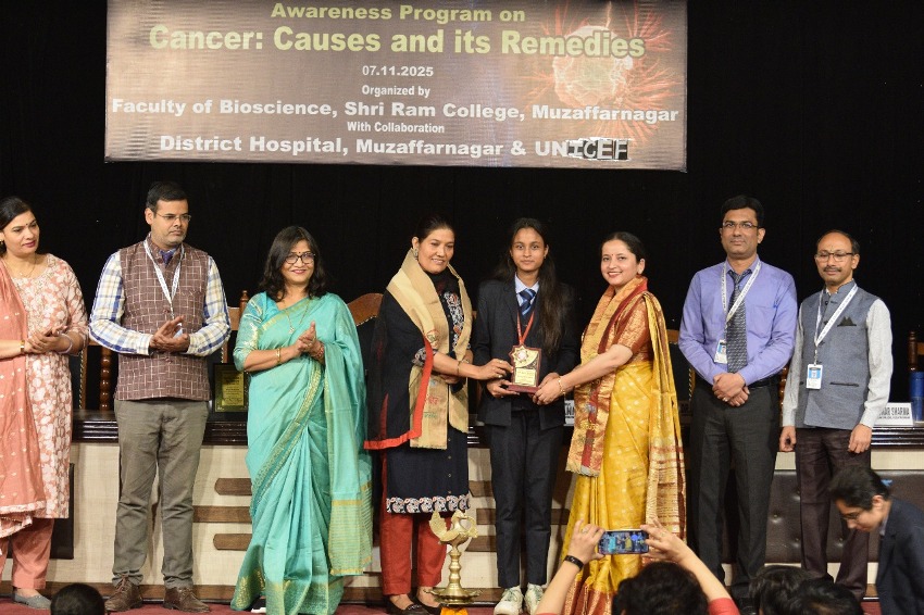Today, in the auditorium of Shri Ram College, Muzaffarnagar, the Department of Biosciences organized National Cancer Awareness Day under the joint aegis of UNICEF and District Hospital Muzaffarnagar, in which the topic of the program was the causes and treatment of cancer.