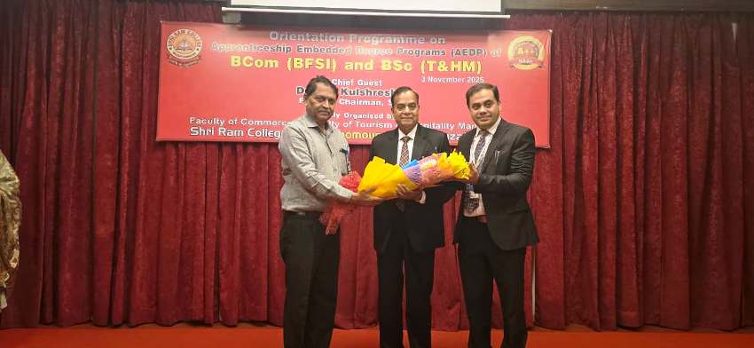Under the Government of India's multifaceted Apprenticeship Embedded Degree Program (AEDP) initiative in the field of education, Dr. S.C. Kulshrestha, Founder Chairman of Shri Ram Group of Colleges, Muzaffarnagar, today successfully organized an orientation program for newly admitted students in B.Com. (Banking Financial Services and Insurance) and B.Sc. (Tourism and Hospitality Management) courses under the AEDP (Apprenticeship Embedded Degree Program). The program was inaugurated by lighting the lamp by the Chief Guest, Founder Chairman Dr. S.C. Kulshrestha, Director Dr. Ashok Kumar, College Principal Dr. Prera Mittal, Vice Principal Dr. Saurabh Mittal, Dr. Shweta Rathi, and Dr. Ashfaq Ali. The Chairman addressed the students and wished them well on their new academic journey. The program aimed to provide a detailed introduction to the new students' apprenticeship-embedded degree programs, including B.Com. (Banking Financial Services and Insurance) and B.Sc. (Tourism and Hospitality Management).