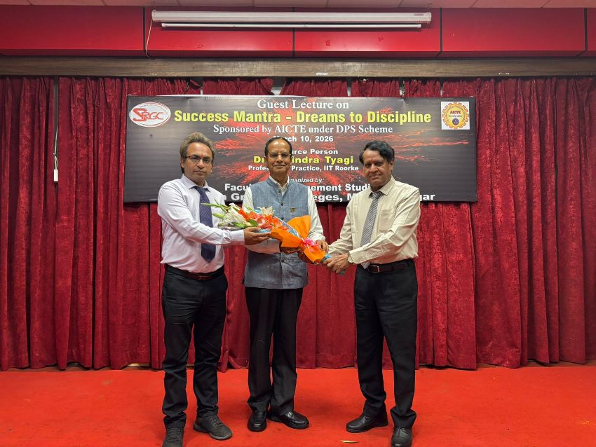 A guest lecture was organized within the Department of Management (MBA) at Shriram Group of Colleges, Muzaffarnagar, under the AICTE-sponsored DPS Scheme. During this event, Dr. Ravindra Kumar Tyagi (Professor of Practice) from IIT Roorkee addressed the students on the topic, "Success Mantra: From Dream to Discipline." Dr. Ravindra Kumar Tyagi emphasized to the students that the fundamental mantra for success lies in firm determination, consistent hard work, effective time management, and a positive outlook. He advised them to maintain unwavering focus on their goals, recognize their inherent talents, identify the root causes of any failures, find solutions to overcome them, and continue moving forward.